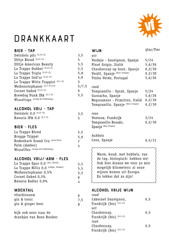Warm, koud, met bubbels, van de tap, biologisch: hebben we! Ook hier kiezen we voor zo min mogelijk kilometers, al onze wijnen komen uit Europa. En lekker dat ze zijn!