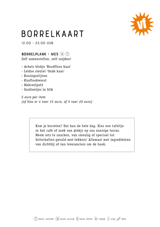 INGREDIËNTEN VAN DICHTBIJZe wisselen natuurlijk een beetje, per seizoen. Niet altijd is hun poduct op de kaart terug te vinden, maar dat kan ook zo weer veranderen! Van De Stoerderij uit Breugel gebruiken we o.a. buffelmozzarella, hangop, yoghurt en vanille-ijs. De escargots komen uit Nieuwaal (links van Zaltbommel), van Slow Escargots. Al ons brood? Speciaal voor ons gebakken in Heusden, door Bakkertje Deeg. Net als de vegan gevulde koek trouwens en het enige-echte-Verkadegebakje. De mooiste kazen halen we bij Het Kaasatelier in Oud Gastel, waar ambachtelijke kazen van kleine boeren worden gerijpt. Het varkensvlees komt eigenlijk uit heel het land: de Buitengewone varkens (het bedrijf zelf zit in Ingen) worden namelijk overal in Nederland geplaatst om te kunnen wroeten, scharrelen en luieren op akkers, in bossen en weilanden. Op onze kaart vind je hiervan regelmatig pikante worstjes en buikspek terug. Bij Seafarm uit Kamperland halen we scheermessen en Angelo uit Noord-Limburg teelt schorseneren, waarmee hij de schorseneren-kroketten maakt die je wel eens op de borrelkaart terugvindt.